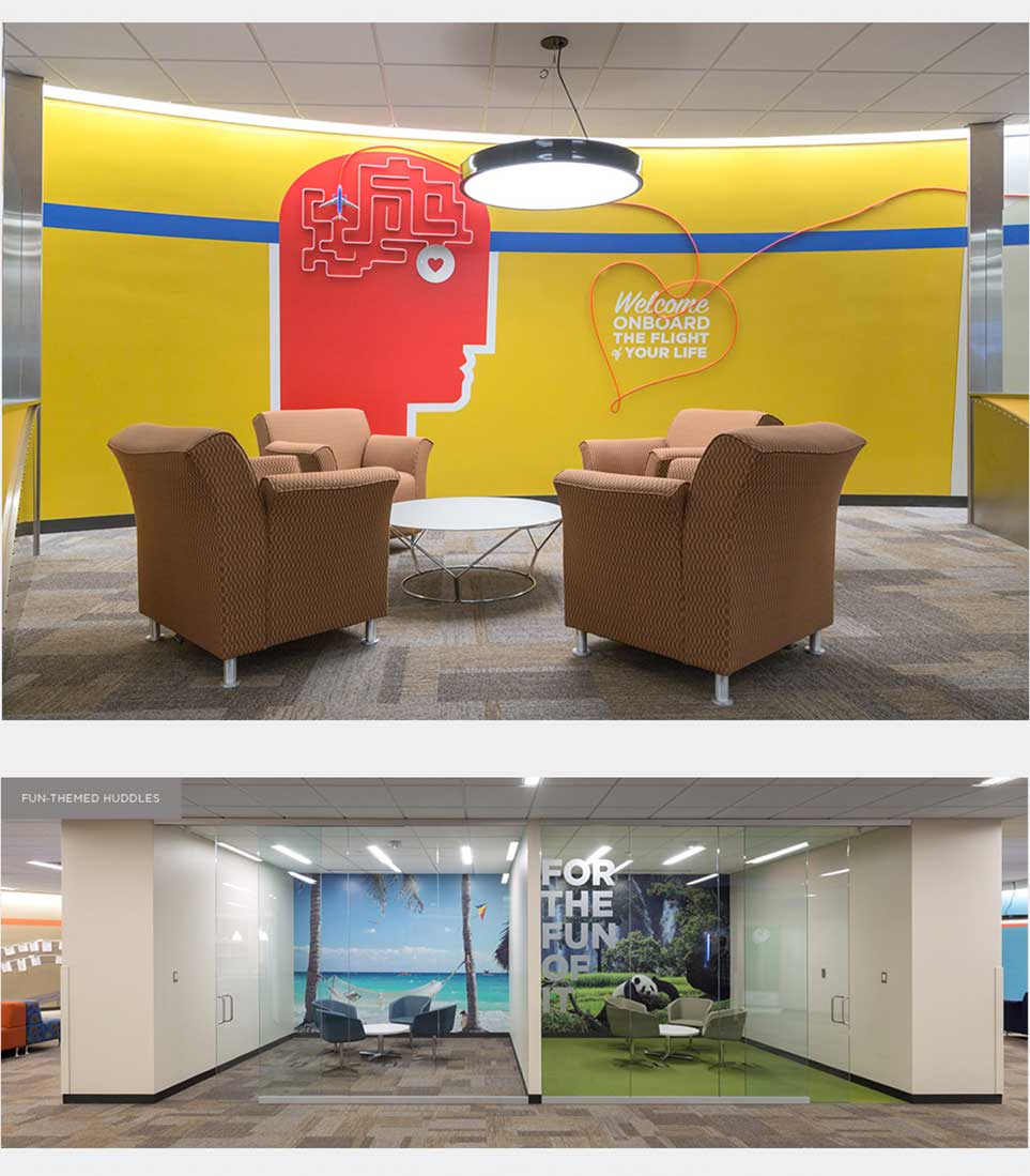 Designing a space for a client always involves learning all about their vibe and culture. So designing for Southwest Airlines' Learning & Training facility, was a lesson in projecting both their fun-luving side along with their serious side seamlessly. Whether it was an airplane cowling or a Southwest small-scale model airplane, we collaborated to achieve an outcome that is a series of eye-catching vignettes around every corner.